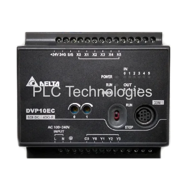 The Delta DVP10EC00R3 PLC is an economical and compact programmable logic controller (PLC) designed for basic sequential control and communication monitoring tasks. It supports 10 to 60 I/O points and offers a program capacity of 4k steps, making it suitable for small-scale automation projects. Equipped with built-in RS-232 and RS-485 communication ports (in models with 16 to 60 I/O points), the DVP-EC3 Series supports Modbus ASCII/RTU protocols, facilitating integration with various control devices such as frequency inverters and temperature controllers. Additionally, it features four high-speed counters for applications requiring precise counting capabilities. Typical applications include standalone control units, landscape fountains, and building automation systems. Its cost-effective design and reliable performance make the DVP10EC00R3 PLC a practical choice for users seeking a straightforward PLC solution.