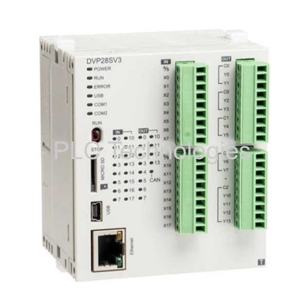 The Delta DVP28SV311S PLC is a high-performance, third-generation slim-type controller designed to meet the demands of advanced industrial automation. Equipped with a 32-bit processor from Delta’s AS Series, it delivers exceptional execution speed of 25 nanoseconds for basic instructions, making it ideal for applications requiring rapid and precise control. The DVP28SV311S PLC offers a substantial program capacity of 64K steps and supports up to 512 I/O points, expandable via up to 8 modules on both sides, providing flexibility for complex system configurations. It features built-in communication interfaces, including dual RS-485 ports, a CANopen DS301 port, Ethernet supporting EtherNet/IP and Modbus TCP protocols, and a Micro SD card slot for data logging and program storage. The PLC is programmable using Delta’s DIADesigner software, which enhances security and system integration. With its compact design and robust capabilities, the DVP28SV311S PLC is well-suited for applications such as high-speed motion control, material cutting machines, crane-based lifters, and HVAC systems.